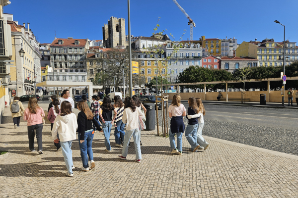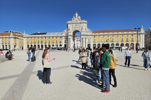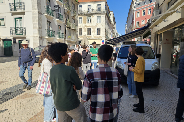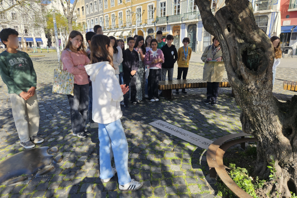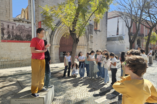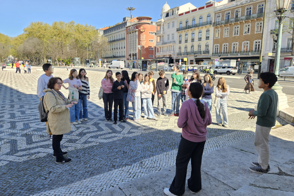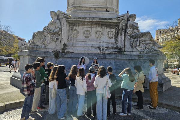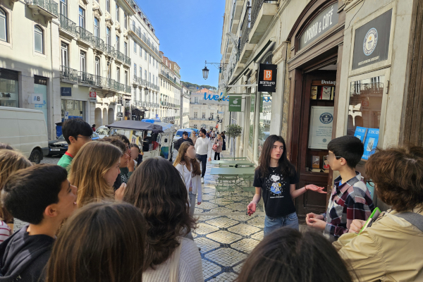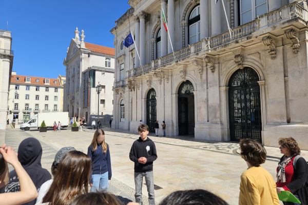 Esta semana, o grupo do 8.º ano visitou a Baixa Pombalina. Efetuou paragens em vários pontos de interesse e, em cada um deles, um par de alunos falou aos colegas sobre o significado histórico desse local.